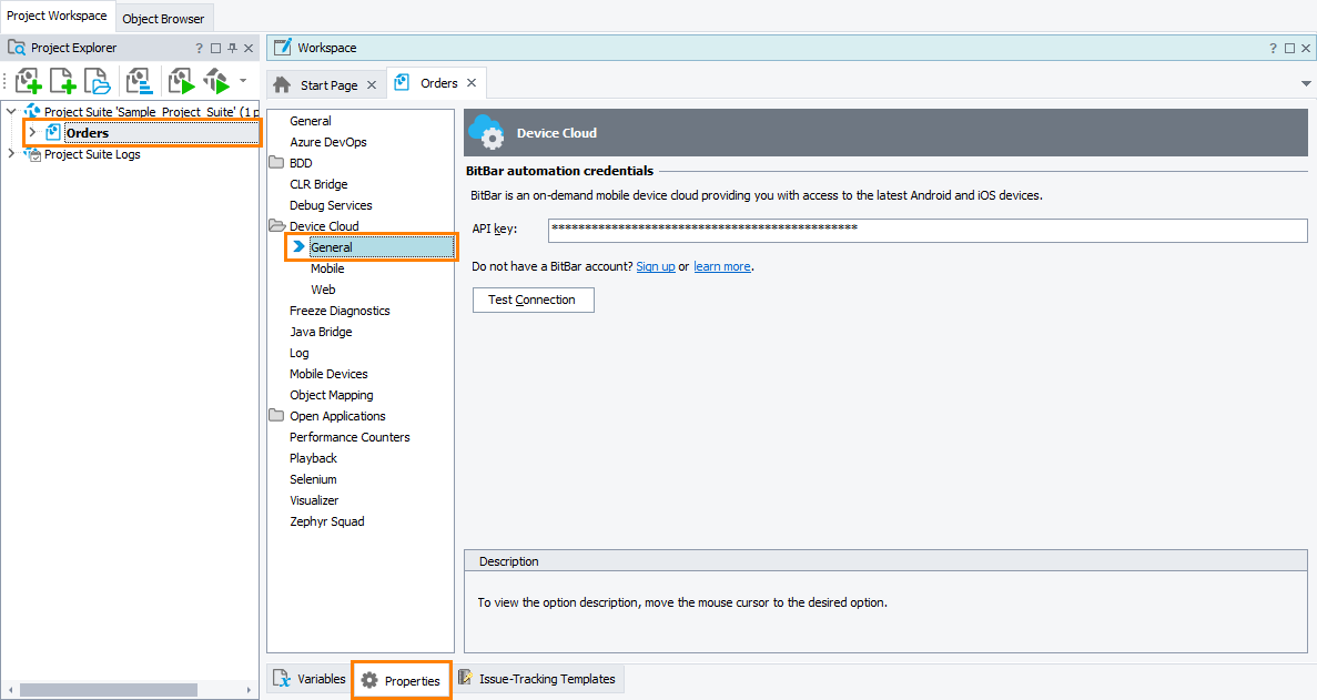 You can click Test Connection to make sure that TestComplete can access the BitBar API using the specified key.