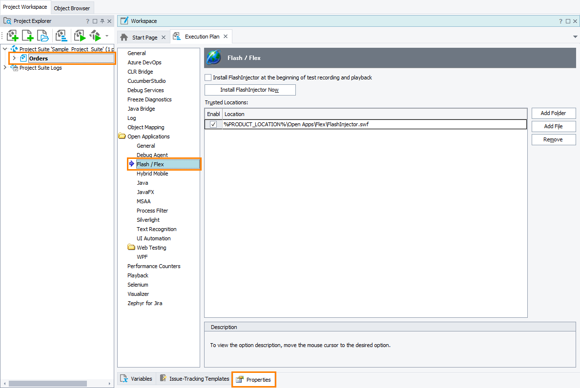 - Install FlashInjector at the beginning of the test recording and playback - Specifies whether TestComplete should automatically install FlashInjector when the recording or test run starts.